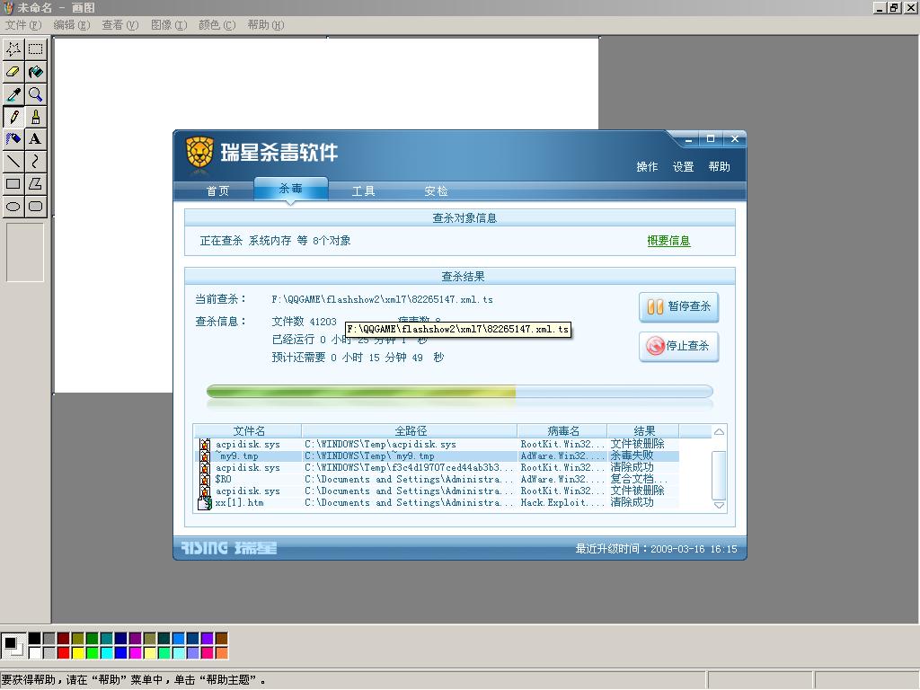 楼主最后一次升级还是3月16日,建议升级瑞星至最新版本后,进入安全模式杀毒。