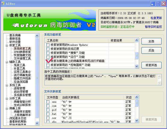 勾上 修复右键菜单上的病毒和无法打开磁盘——修复所选。