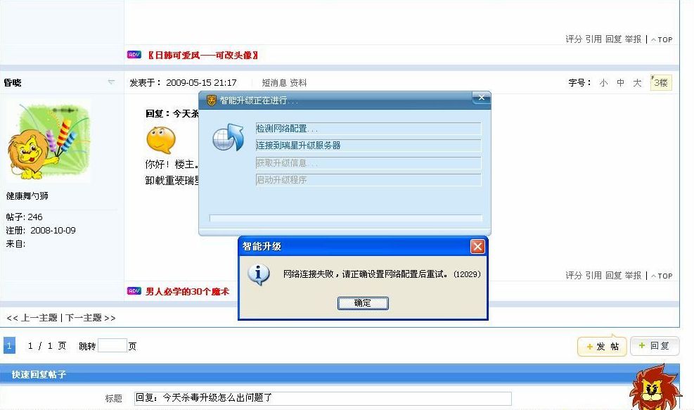 只安装了瑞星,不是局域网,前些天升级一直正常。