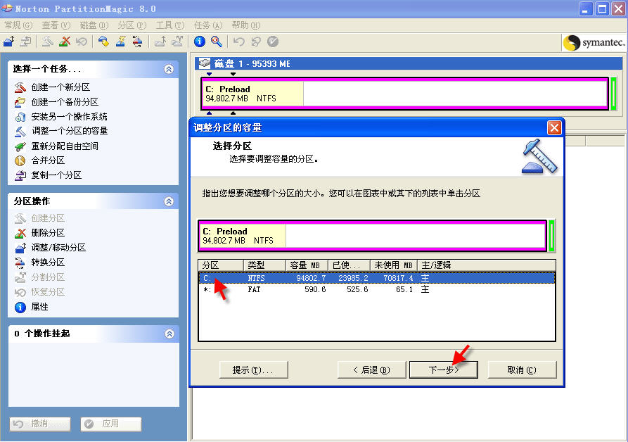1、在一个100G硬盘的本本上运行PQ,首先见到的就是这些。动手增加分区前,切记不要忽略了这个绿框框。