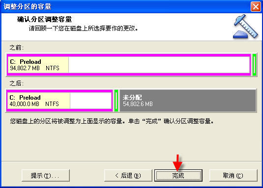 a.调整原C分区大小(本例为94.8G变为40G)。