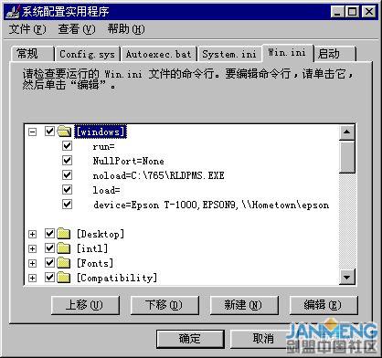 在win.ini文件中,[WINDOWS]下面,“run=”和“load=”行是Windows启动时要自动加载运行的程序项目,木马可能会在这现出原形。必须要仔细观察它们,一般情况下,它们的等号后面什么都没有,如果发现后面跟有路径与文件名不是你熟悉的或以前没有见到过的启动文件项目,那么你的计算机就可能中上木马了。当然你也得看清楚,因为好多木马还通过其容易混淆的文件名来愚弄用户。如AOL Trojan,它把自身伪装成command.exe文件,如果不注意可能不会发现它,而误认它为正常的系统启动文件项。