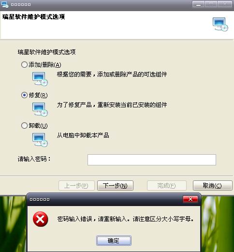 电脑中毒后,瑞星杀毒和防火墙全部不再主动防御,开机不再随机启动,现升级至最新版本后,可以杀毒,但是监控却再也打不开,且防火墙不随机工作。根据网上达人建议,使用瑞星杀毒自动修复功能,因装软件时设置了用户密码,因此在输入用户密码时却 提示错误,无法修复,(个人打包票密码绝对正确,天地良心啊)如图: