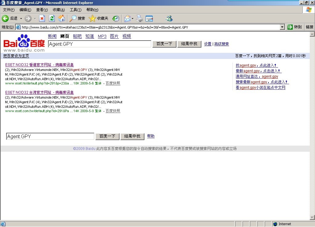 .我用瑞星没有查出来病毒木马,却用一个叫NOD32的查出电脑里有病毒(Agent.GPY),可我百度了一下名称(Agent.GPY)发现只有NOD32的官网上有该病毒信息,请看我上传的图片!觉得蹊跷!请帮我解答一下,非常感谢!
