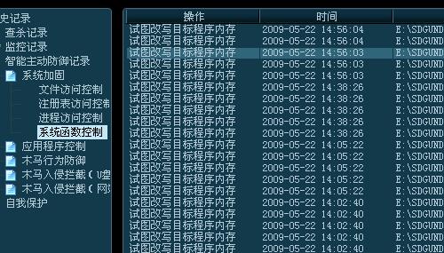 果然在 智能主动防御记录--系统加固--系统函数控制的日志里查到了记录,如图