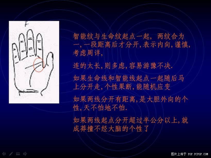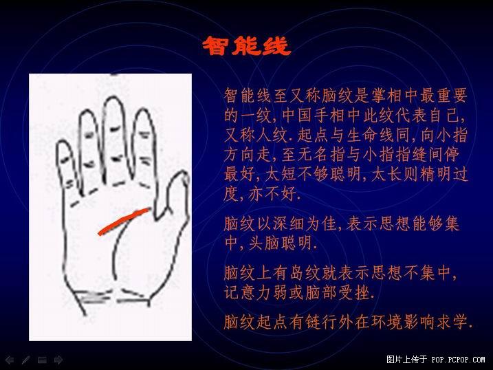 智能线至又称脑纹是掌相中最重要的一纹,中国手相中此纹代表自己,又称人纹.起点与生命线同,向小指方向走,至无名指与小指指缝间停最好,太短不够聪明,太长则精明过度,亦不好.