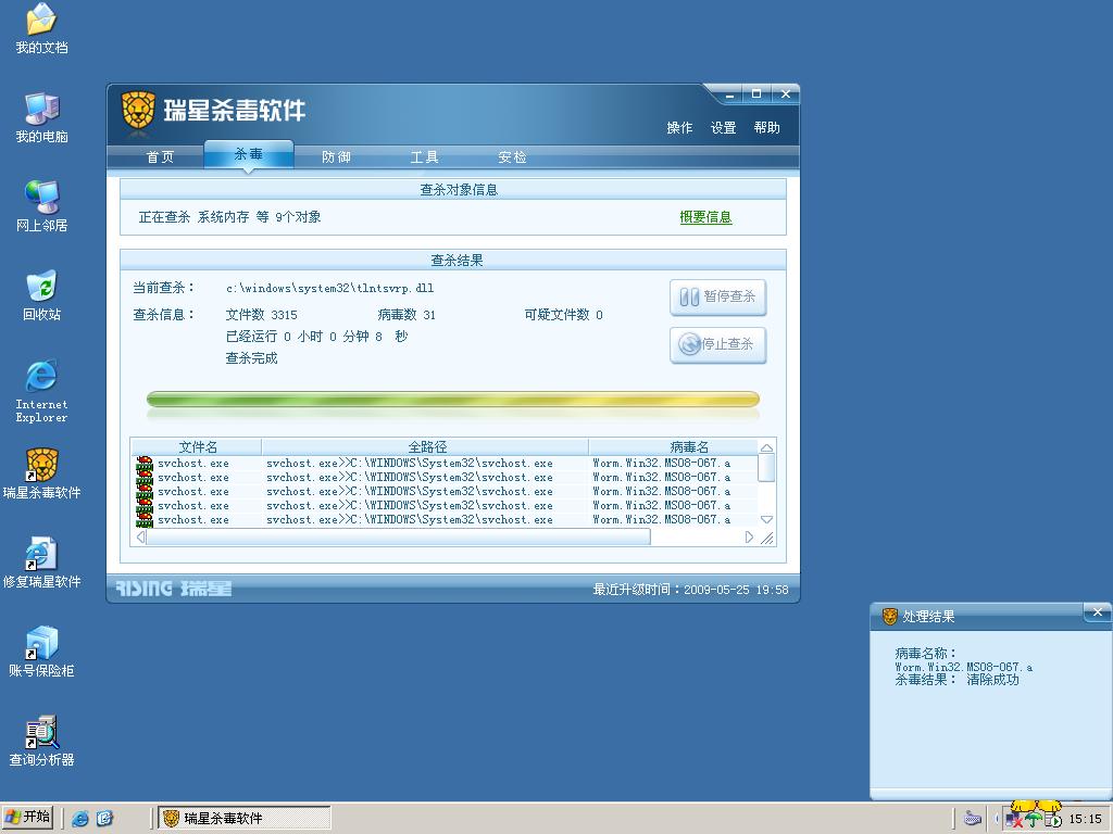 我的电脑安装的WIN2003操作系统,用的是瑞星正版软件,最近用瑞星最新版本查杀出Worm.win32.ms08-067.a病毒