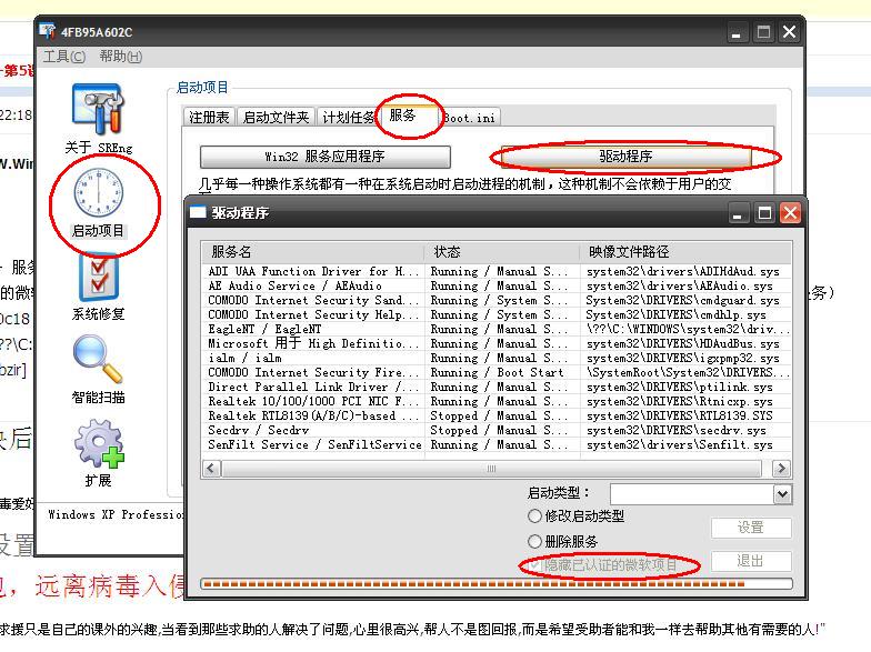 (勾选隐藏已认证的微软项目,选中有问题的驱动/服务后,点"删除服务",点"设置"按钮即可。注意弹出的窗口中要点"否"才是确认删除服务)