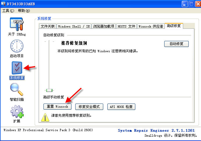 在扫日志的SRENG工具》系统修复》高级修复》重置Winsock