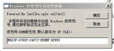 http://hi.baidu.com/mignoncat"&vbCr&vbCr&" 本程序将自动替换你当前 Windows 的序列号,通过微软验证完全正版。"&vbCr&vbCr&"序列号(OEM版无效,默认版本为 XP VLK):","Windows XP序列号自动更换器","MRX3F-47B9T-2487J-KWKMF-RPWBY")