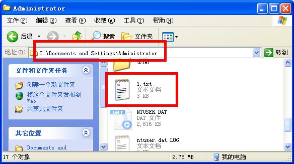 接着,你就可以到c:\documents and settings\administrator目录(你在命令提示符下什么路径下(下图1处)输入的命令,就是1.txt所在的路径)下去找这个1.txt,如图,我就在这里找到1.txt,简单吧……:default15: