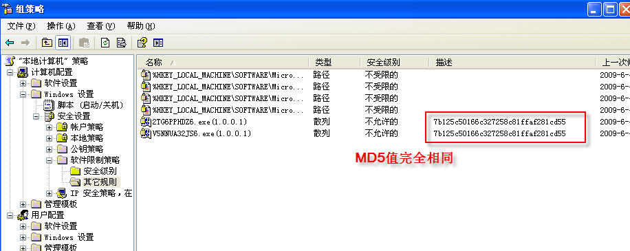 此毒可用组策略中的“软件限制策略”散列规则预防(设置一条散列规则即可。图1的散列规则是为对比两个病毒文件是否相同所设)