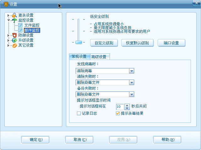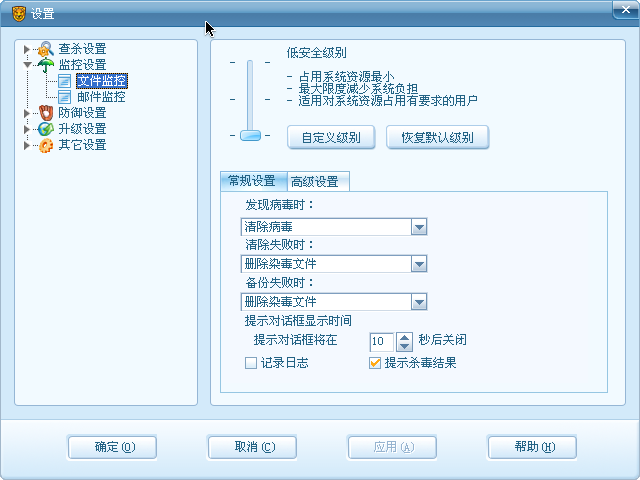 就是希望让系统速度快些(我配置普通),把“监控设置”里的安全级别都改为“低”,但是“防御设置”里的都还是“中”