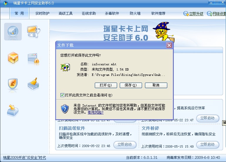 一打开瑞星卡卡这个下载提示就在哪里跳 点 取消 保存 打开 都不行