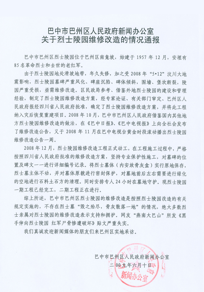 巴中市巴州区人民政府新闻办公室关于烈士陵园维修改造的情况通报巴中市巴州区烈士陵园位于巴州区南龛坡,始建于1957年12月,安埋有85名革命烈士和去世的老红军。由于烈士陵园地处滑坡地带,年久失修,加之受2008年“5□12”汶川大地震影响,烈士陵园墓碑严重风化、碑座沉陷、碑体倾斜,围墙、堡坎断裂,陵园严重受损,亟需维修改造。区民政局参考、借鉴外地烈士陵园的建设和管理经验,制定了烈士陵园维修改造方案,经专家论证、有关部门审定、巴州区人民政府报经四川省人民政府批准,确定了烈士陵园维修改造方案,并将此工程纳入灾后恢复重建项目。2008年10月,巴中市巴州区人民政府借鉴国内其他地方烈士陵园维修改造的做法,在《巴中日报》、《巴中电视报》上向全社会发布了维修改造公告,又于2008年11月在巴中电视台黄金时段滚动播出烈士陵园维修改造公告一周。2008年12月,烈士陵园维修改造工程正式动工,在工程施工过程中,严格按照四川省人民政府批准的维修改造方案,坚持专业保护性施工,对墓碑的位置及碑文一一进行详细编号记录。将烈士墓体(内安放骨灰盒)实行原地保存,烈士墓主体不动,并对墓体原貌进行密封保护,对墓地前后左右需要进行绿化的空地进行石料土石方的清理。同时安排专人24小时在墓地守护。现烈士陵园一期工程已经完工,二期工程正在进行。综上所述,巴中市巴州区烈士陵园的维修改造是按照烈士陵园改造的有关规定实施的,不存在烈士墓“毁之殆尽,骨灰散落一地”的情况,绝大多数烈士亲属对烈士陵园的维修改造表示支持和拥护。网友“燕南大巴山”所发《黑手伸向烈士陵园 红军尸骨惨遭破坏》贴文严重失实。我们真诚欢迎新闻媒体的朋友们来巴州区实地采访。巴中市巴州区人民政府新闻办公室 二00九年六月十日