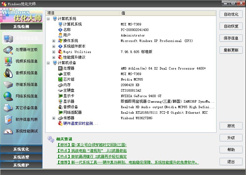 :kaka1: 优化大师...... 据我个人使用的经验来说最多用它清理一下注册表或系统垃圾. 设置方面的优化, 说实在的, 不懂的千万不要让它胡乱自动设置, 很容易造成一些莫明其妙的系统问题.