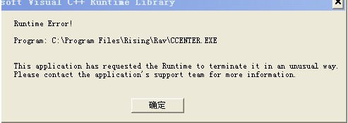 方法1:关闭杀毒软件自我保护,将瑞星杀毒软件安装目录(默认为:C:\Program Files\Rising\Rav)update下的mfc42.dll、mfc71.dll、msvcirt.dll、msvcp60.dll、msvcp71.dll、msvcr71.dll、msvcrt.dll这7个文件复制粘贴到杀毒软件安装目录下(C:\Program Files\Rising\Rav)下,重启计算机判断。