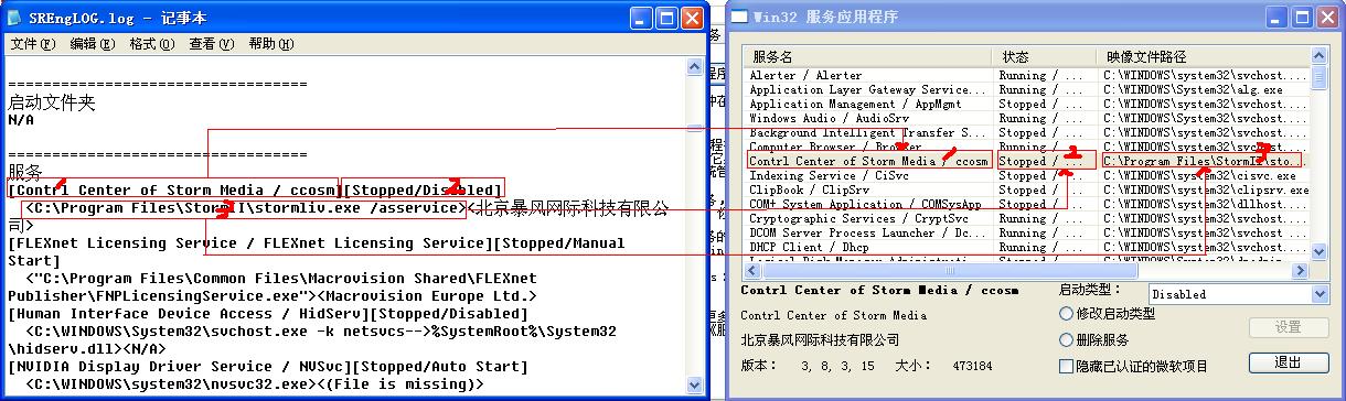 日志某一个服务或驱动程序内的各部分内容,与SRENG扫描工具的显示,是一一对应的,见下图: