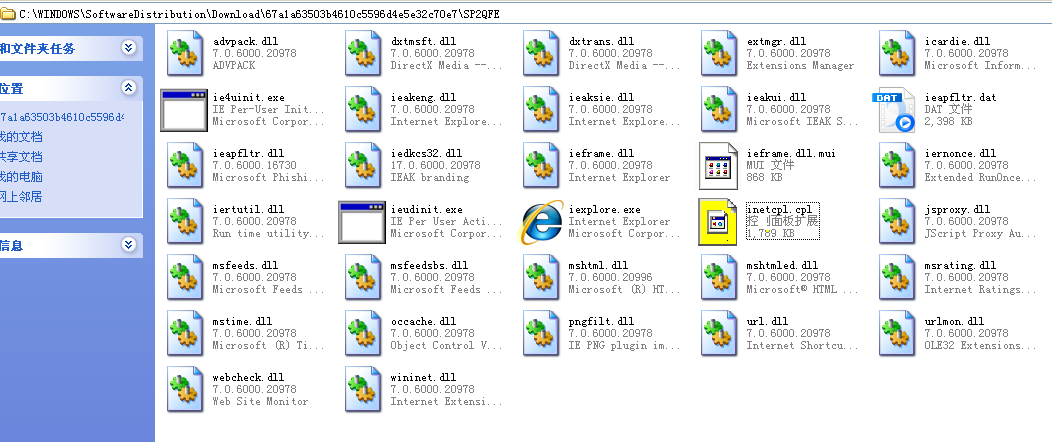 我的笔记本杀毒,杀到这个文件夹{ C:\WINDOWS\SoftwareDistribution\Download\67a1a63503b4610c5596d4e5e32c70e7\SP2QFE},在“SP2QFE”文件夹中的有个“inetcpl.cpl”的文件,说是什么“控制面板扩展”时就不动了(如图中标黄色的图标),好久都没动的,