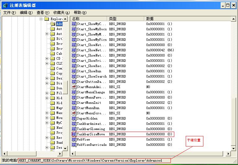 (操作子键:\Software\Microsoft\Windows\CurrentVersion\Exploter\Advanced)