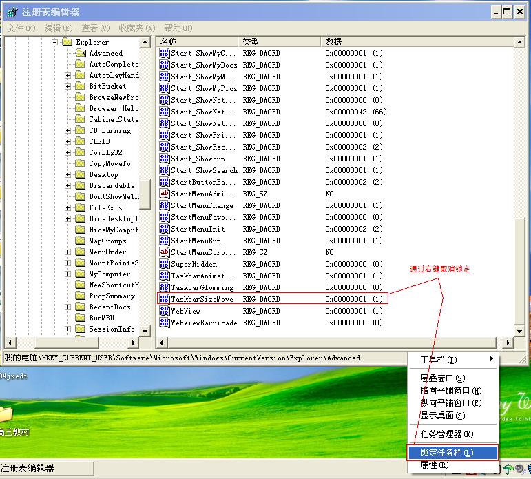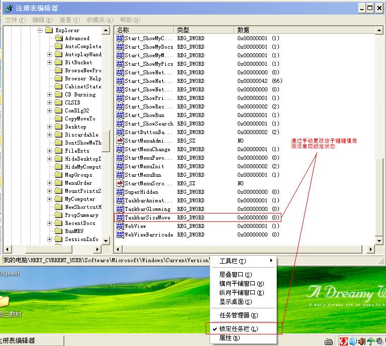 将其子键下的TaskbarSizeMove (reg-dword)键值设为1后,没有出现解除锁定效果,而通过右键解除锁定后又明确的发现该值从0变为了1(证明没有改错子键)