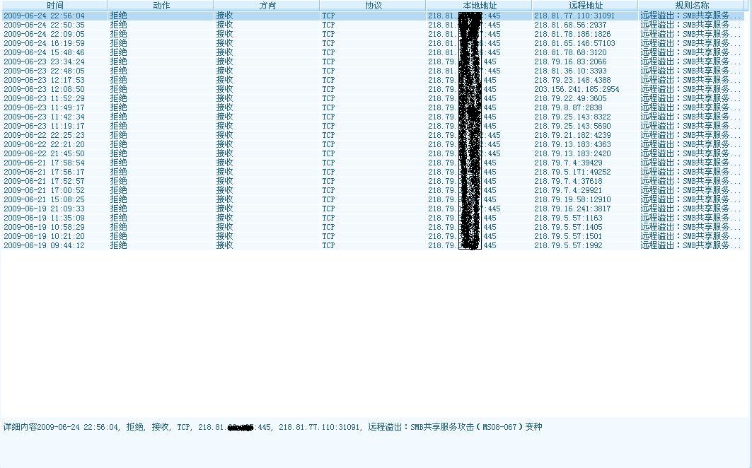 最近老提示拦截了“远程溢出:SMB共享服务攻击(变种)”ID:MS08-067。最厉害10分钟内攻击了6次。