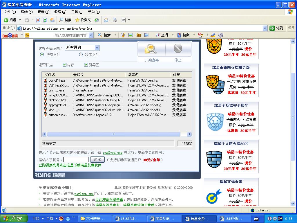 “木马群”病毒专杀及修复工具以后还是无法杀毒,打不开瑞星软件,右下角任务栏中不显示杀毒和防火墙图标,在安全模试下也无法打开!但是瑞星可以升级!!用在线查毒结果如下:见图。请帮忙!急!多谢!
