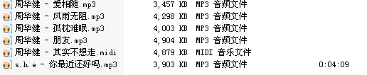 各位高手,最近遇到一相当奇怪的问题:kaka2::kaka2::kaka2:,计算机上显示为MP3音频文件,却不显示时间持续时间,复制到手机后,怎么也无法播放。截图如下(最后一首可以在手机中播放)。帮忙想个解决办法或者是解释一下原理。谢谢!!!!!!!!