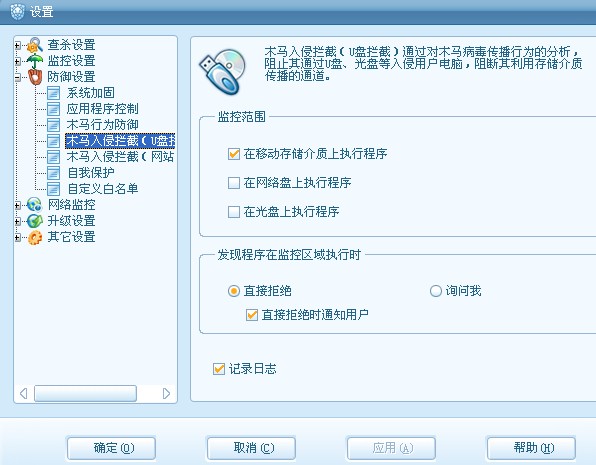 木马入侵拦截(U盘拦截)取代了原来的U盘监控,控制范围更广,能够更好地控制执行区域,避免外部病毒感染到主机。当木马入侵拦截(U盘拦截)范围内的程序试图自动运行或直接运行的时候,进行拦截,并提示用户。