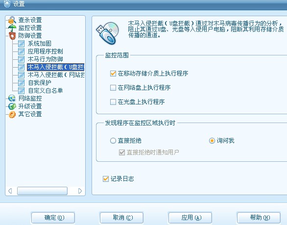 http://shop.rising.com.cn/help/index.htm木马入侵拦截(U盘拦截)通过对木马病毒传播行为的分析,阻止其通过U盘、光盘等入侵用户电脑,阻断其利用存储介质传播的通道。