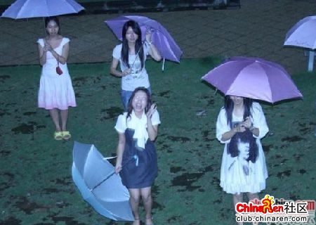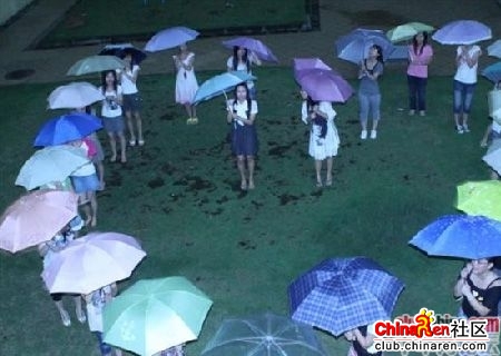 首先女生们列队呼唤男生,等待男生的出现···· 女生们围成心形···女生们将手中的雨伞化作吉他忘情歌唱,跳舞··· 围观群众不断欢呼。