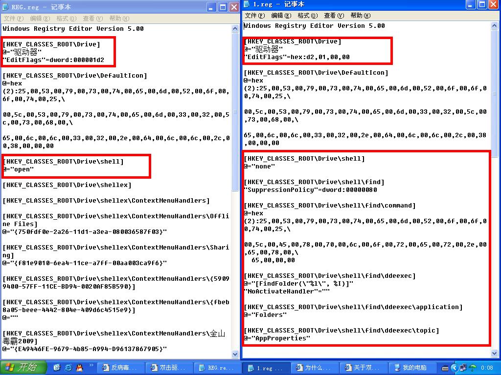 根据对你上传注册表文件和我机正常文件的比对,个人认为你机驱动器双击弹出“打开方式”问题,系有关注册表项被篡改所致。