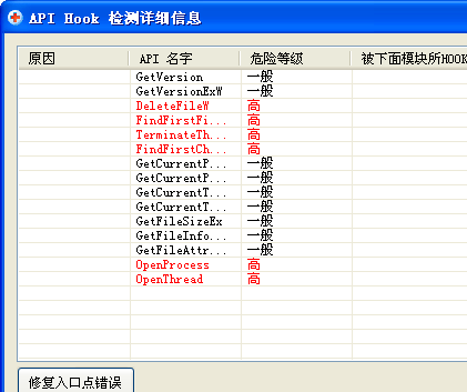 而且扫描的日志在一开机的时候,API HOOK这一快是空的,可是开机一段时间后,再扫描日志,这里就多了很多东西,(危险等级: 一般。危险等级: 高)这样的很多