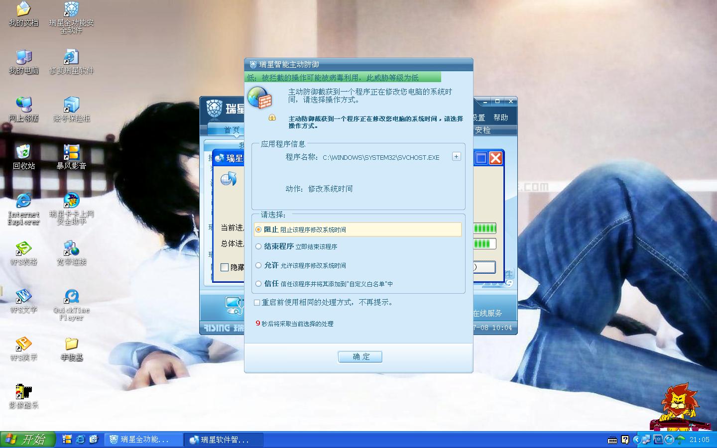 瑞星主动防御提示,系统程序通过网络修改电脑时间,应是你开启自动与internet时间同步选项了,选择放行就可以了。
