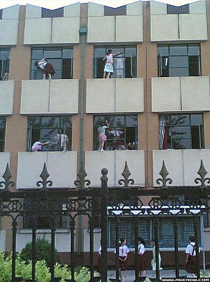 这种事情有专门的保洁公司做的,学校怎么能让小学生这样做啊!一点安全意识都没有哦!