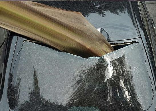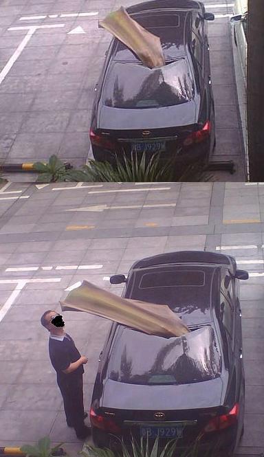 正午,坐在座位上,听到外面有点动静,探头一看,楼下一辆卡罗拉被掉下来的椰子树的树叶给“插”了。“插”的还很深。车顶钢板已经变形了,目测那椰子树叶应该没这么重,纸糊的?