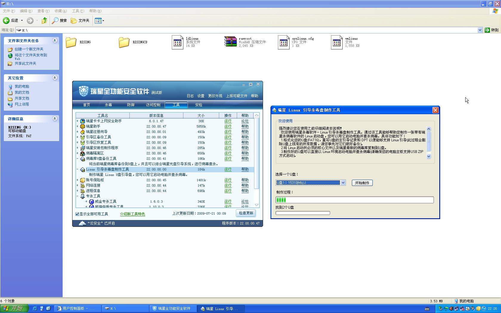 按上述制作了引导杀毒U盘,并执行了病毒库U盘备份工具,见图中RISINGCD文件夹(病毒库是最新的)。