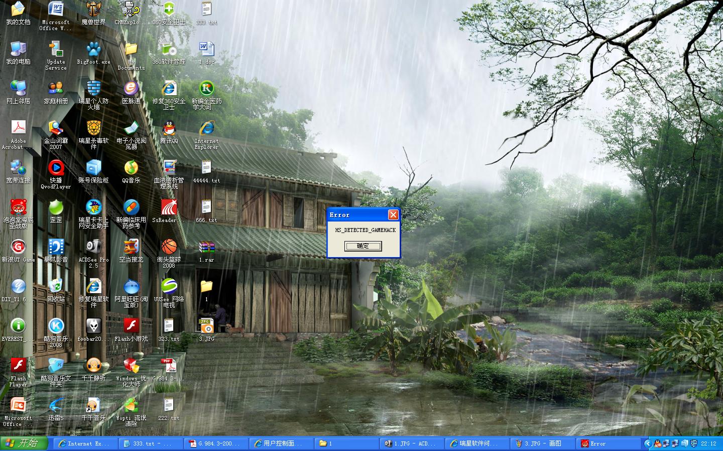 2刚一点击瑞星软件后,弹出错误窗口HS_DETECTED_GAMEHACK,且最小化的泡泡堂程序也有error