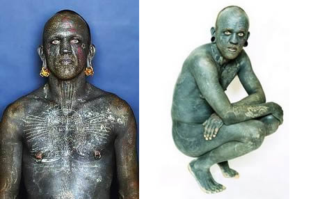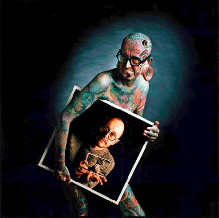 你一定听说过全身布满蓝色纹身的“谜”,Paul Lawrence。Paul Lawrence是一个特技爱好者,时常表演特技,如:吞剑,以电钻钻鼻子;吞咽各种液体再由肚子里逼出来,随后再咽下去。不仅是以为特技表演者,他还是一个音乐家。