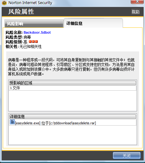 还有前天Norton又查出一个病毒,也杀不掉,名字叫Backdoor.Sdbot,显示无法从不受支持的文件中删除。