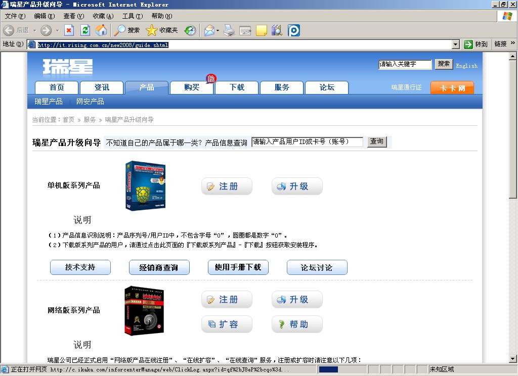 你家是电信吧!我家的就是电信,直到现在还进不去,去同事家的网通每次都可以!不会是瑞星搞歧视吧~!