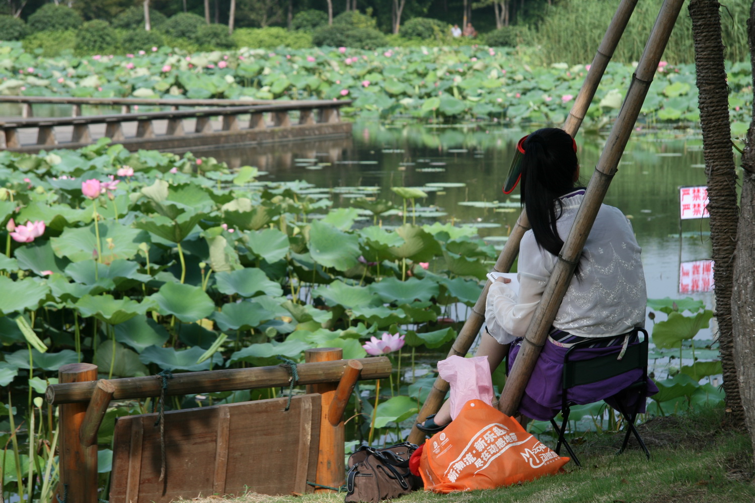 这张图象的焦点太近了,以至于图像的景深太近了,应当把焦点对着女孩前面的荷花的稍远一点的地方,这样景深的效果就出来了。