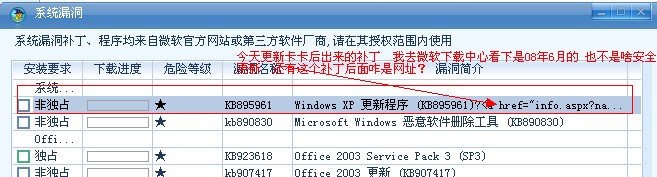 我的系统 SP3 XP 卡卡版本6.0.1.48 扫描漏洞 出来个KB895961 这个补丁 我去微软下载中心看了下是08年的补丁 :kaka2:而且是个要求 验证系统正版后 才可以打的补丁? 图上的 补丁 后半部分杂事网址?好像没写全的网址哦。。。。