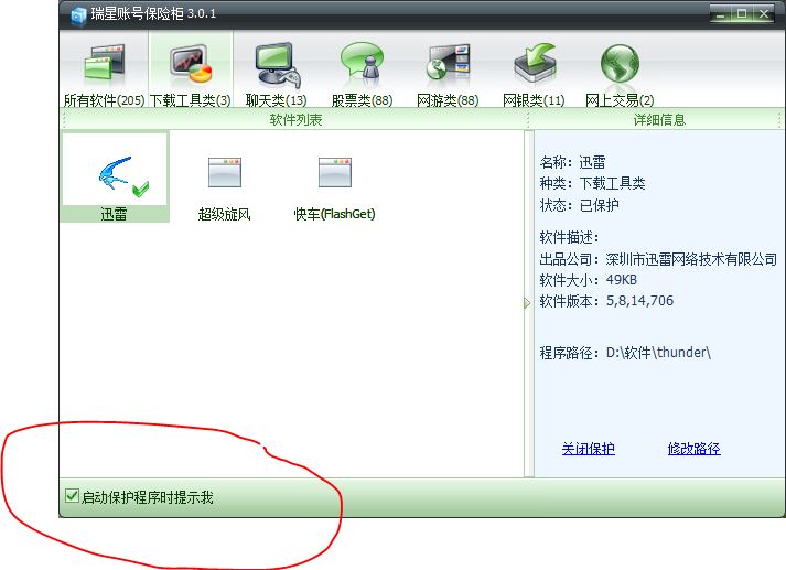 保险箱保护的所有程序在运行时都没有提示,我在“启动保护程序提示我”和“启动电脑时自动启动瑞星账号保险柜”都打了勾的。