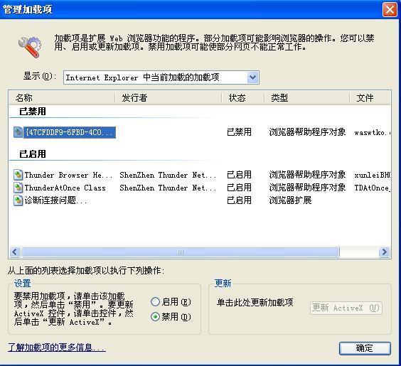 打开IE浏览器 ——工具 ——管理加载项 ——禁用下图中选定的加载项禁用即可修护. (也可以直接找到并栓出waswtko.dll)