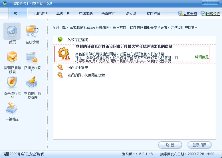 提示:请谨慎选择此项,如果选择屏蔽匿名方式获取本机的信息,也将导致其他用户无法访问到本机的共享文件夹。恢复此设置需要操作注册表,变更[restrictanonymous]键值的数据为“0”。