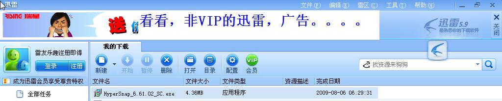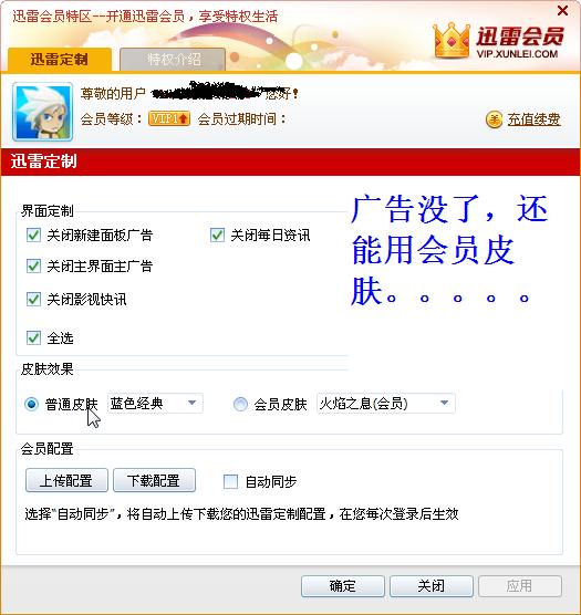 P.S. 只适合最新的5.9.6.1018 若迅雷高于5.9.6.1018(至09.8.08日时为最新版) 会提示不是会员 但是依然可以保持会员皮肤 但不能更换了 阻止广告依然有效