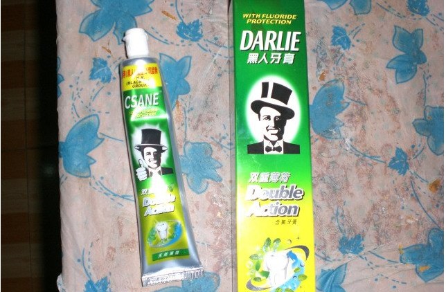 识,CSANE,正版的是DARLIE。出品公司山寨的是香港(黑人)集团公司监制,生产商是广州市