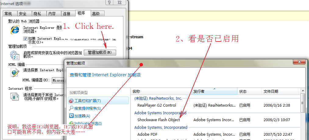 打开 桌面 Internet Explorer 属性 程序 管理加载项 找到shockwave flash object 选择 启用 确定