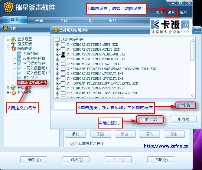 瑞星的主动防御白名单中,方法: